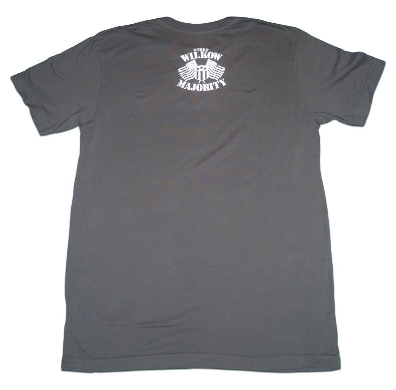 Back: Wilkow Majority Logo. Men’s Short Sleeve Tee with water based Discharge printing (for that super soft feel) on a Custom dyed “PARKERIZED” color, 30 Singles Ring Spun 100% cotton, Short Sleeve tee.