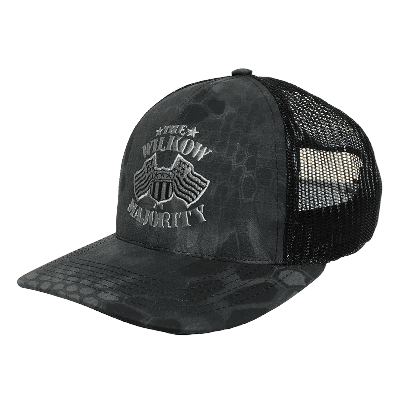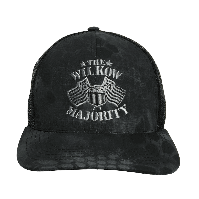 Embroidered Wilkow Majority hat with mesh (Trucker) back. One Size Fits All, MADE IN USA.